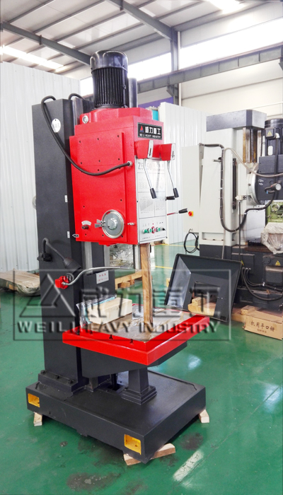 【產(chǎn)品描述】:立式鉆床 主軸豎直布置且中心位置固定的鉆床,簡稱立鉆。常用于 機械制造和修配工廠加工中、小型工件的孔。 立式鉆床加工前,須先調(diào)整工件在工作臺上的位置,使被加工孔中心線對準(zhǔn)刀具軸線。加工時,工件固定不動,主軸在套筒中旋轉(zhuǎn)并與套筒一起作軸向進給。工作臺和主軸箱可沿立柱導(dǎo)軌調(diào)整位置,以適應(yīng)不同高度的工件。 立式鉆床作為鉆床的一種,也是比較常見的